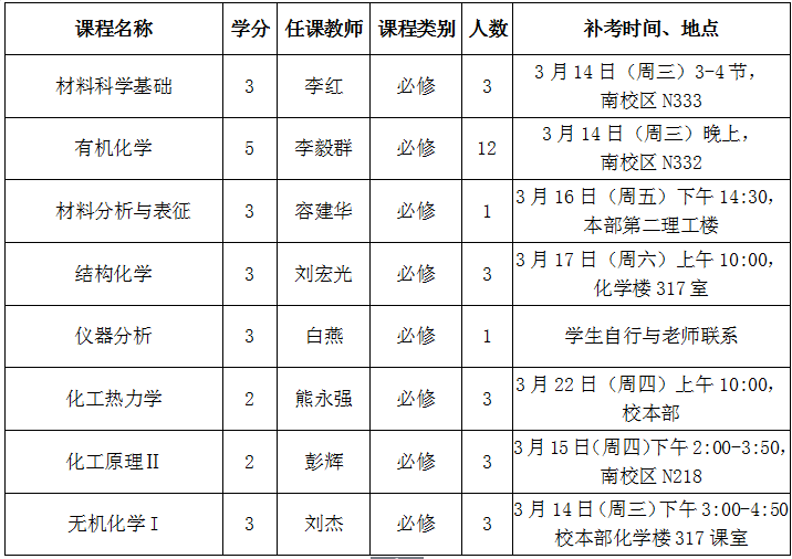 3、补考安排为化学与材料学院教师对院内学生任课的课程,其他课程及院外教师任课补考安排请留意教务处或相应学院的网站。