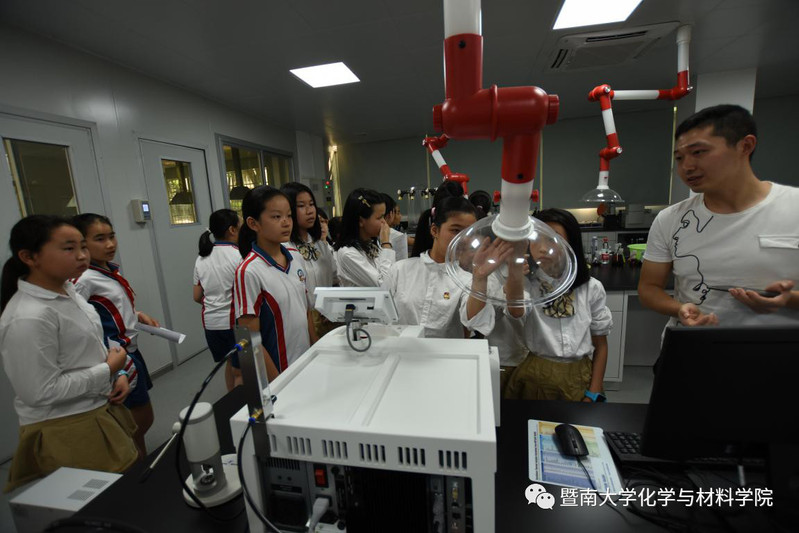 活动于15:00正式开始,在研究所工作人员朱晓威和罗东的带领下,同学们参观了研究所的实验室,学习到科研场所中的各种实验仪器、装置的名称、基本作用,让同学们大体上了解化学实验的基本操作、数据采集流程等。