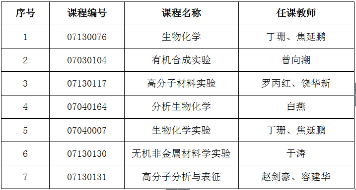 2017-2018学年第二学期,学校教务处组织全校学生进行了课程评估。我院共开设有66门课程,其中《生物化学》(任课教师:丁珊)等7门课程获评优秀,现将优秀课程名单予以公布: