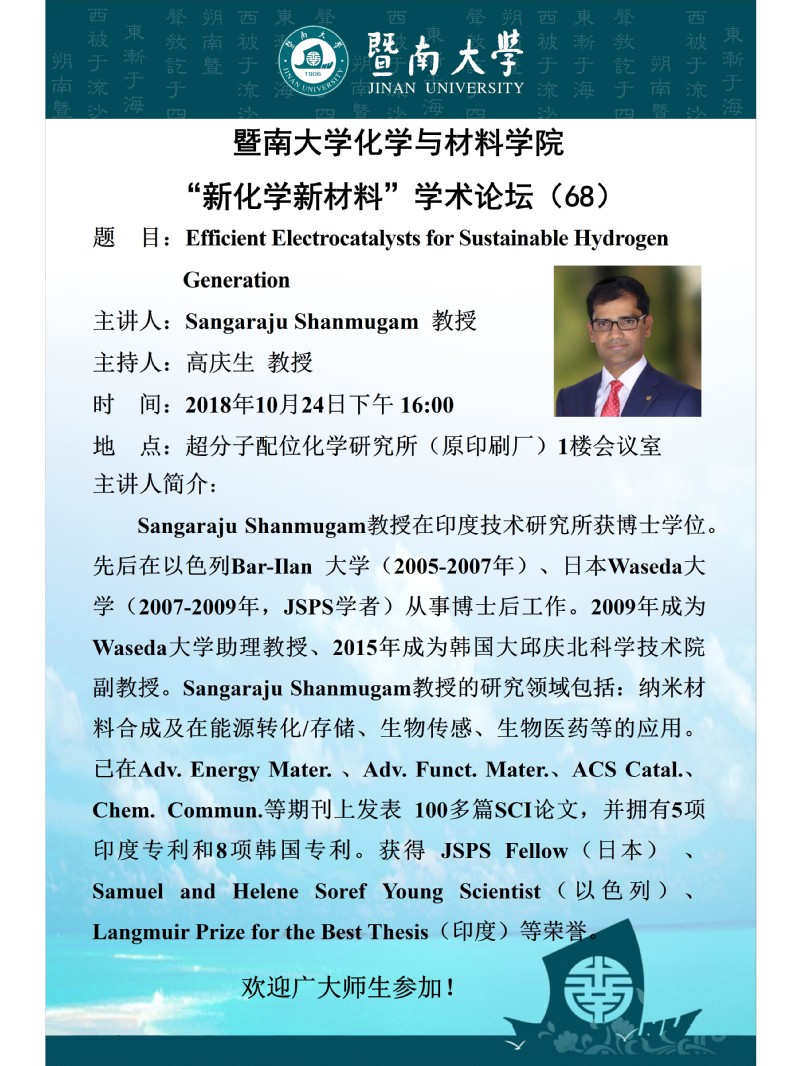 "新化学新材料"学术论坛(68)——Sangaraju Shanmugam 教授