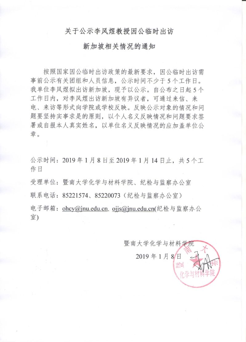 关于公示李风煜教授因公临时出访新加坡相关情况的通知