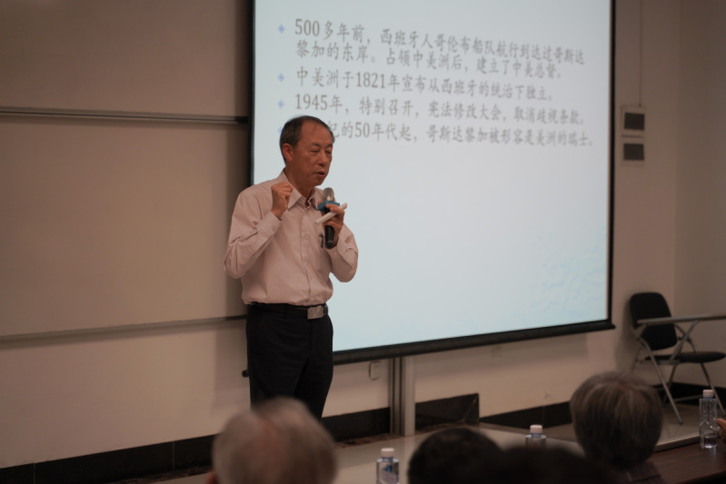 当晚19:00,在邵桂珍书记的主持下,黄耀佳先生在番禺校区教学楼N217教室为我院本科生带来了一场主题为“龙的传人与一带一路——从哥斯达黎加华侨、华人角度去认识” 的博雅大讲堂。讲座开始前,黄耀佳先生与学院互相赠送纪念品。在讲座过程中,黄耀佳先生先由哥斯达黎加和中美洲的自然环境及发展历史谈起,引出中国和哥斯达黎加建交历史,并结合一带一路政策指出海外华侨是中国企业立足国外市场的开拓者,最后号召我们应抓住机遇,运用所学知识为国家外交事业谋求发展。讲座引发了同学们的极大兴趣,大家积极提问,询问了很多关于中外合作交流的问题,并希望“黄师兄”能够在人生规划上为大家提出建议。黄耀佳先生对这些问题一一进行解答,并建议同学们着重培养个人能力,这样才能在未来社会中稳步立足。98级校友古健、陈义康也参加了本次讲座,他们表示,“黄师兄”的讲座内容新颖,从一个新的高度为大家展示了国家发展的过程,为同学们开阔了视野,帮助他们合理规划人生发展。