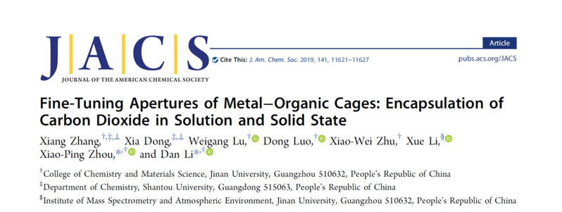 7月24日,kaiyun官方网站入口周小平教授、李丹教授联合课题组于美国化学会旗舰期刊Journal of the American Chemical Society(JACS,IF=14.695)发表题为“Fine-Tuning Apertures of Metal-Organic Cages: Encapsulation of Carbon Dioxide in Solution and Solid State”的研究论文,由于该研究的新颖性及审稿人的高度评价,论文被JACS期刊选为封面论文。研究团队设计合成了一系列菱形十二面体镍-咪唑笼,实现了孔径的精准调控。在液相和固相条件,通过气体压力作用,金属镍-咪唑笼成功实现了对二氧化碳的包覆,模拟了肺泡的功能。研究证明,具有选择性包覆客体分子特性的金属有机笼,可以作为模拟生物功能的人工模型。
