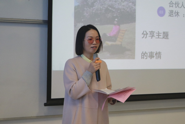 93级校友朱燕倩分享了自己就业—创业——“退休”的故事。她说,要想实现财务自由,首先要明白自己想要什么,然后不断努力去实现它。她提醒同学们,大学四年对未来人生的影响十分重要,大家应努力发掘自己的核心竞争力,规划人生目标,形成独立人格,为进入社会做好准备。她真诚提醒同学们,人生需要靠自己的奋斗去定义,并没有最优选项,希望大家珍惜时光、不要虚度青春。