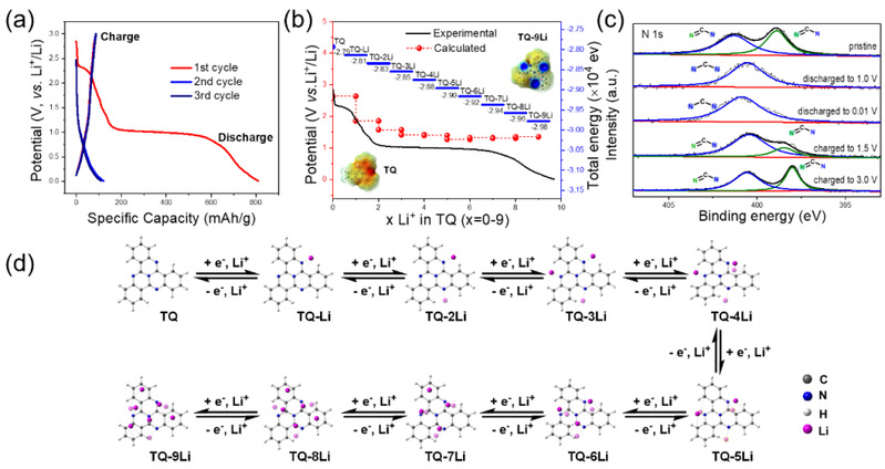 为了探索获得的导电材料的电化学储锂机理,研究人员对TQ分子进行电化学测试,并通过理论计算研究了其锂化反应过程,首次验证了TQ具有9电子氧化还原活性。将TQ构筑在导电金属-有机框架Cu-HHTQ中能够有效提高其作为锂离子电池负极材料的比容量。