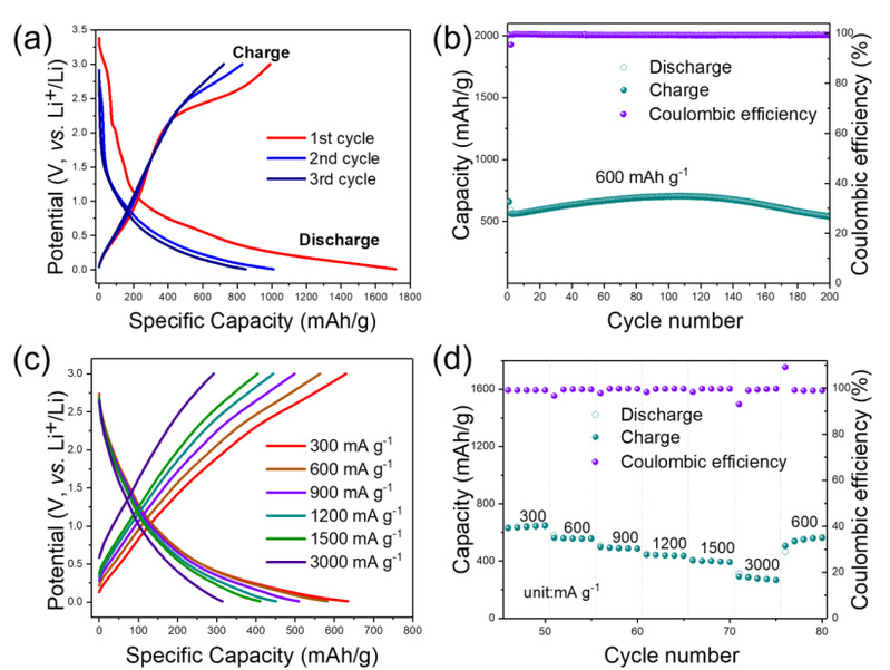 二维导电MOF长程有序的结构使其不溶解在电解液中,具有高循环稳定性,其多孔性以及高电导特性可以加速离子和电子的传输,因此可能成为具有高倍率性能的电极材料。研究发现,得益于Cu-HHTQ的高电导率特性、多孔特性以及多电子氧化还原特性,其作为锂离子电池负极材料表现出了较高的比容量、良好的倍率性能以及优异的循环稳定性。Cu-HHTQ在600 mA g-1的电流密度下可逆比容量达到了657.6 mAh g-1,循环充放电200圈后仍有83%的容量保持率,这在现今报道的导电MOF材料中处于较高水平。