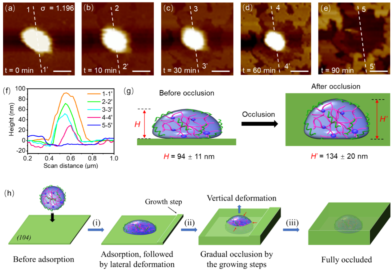 该工作巧妙地设计了一系列柔软度可调的高分子凝胶颗粒,利用该凝胶颗粒与矿物晶体之间的相互作用,实现了凝胶颗粒在矿物晶体中的变形取向内嵌。该工作突破了纳米颗粒从简单的无序内嵌到有序的自取向内嵌,为构建具有复杂多级结构的新型高分子-无机晶态复合材料提供了一种崭新的仿生策略。值得指出的是,该工作利用原位原子力显微镜实时监测了纳米凝胶粒子内嵌方解石的全过程,揭示了纳米凝胶颗粒变形取向内嵌的机理(图2a-f),深化了人们对生物矿物形成机制的认识。