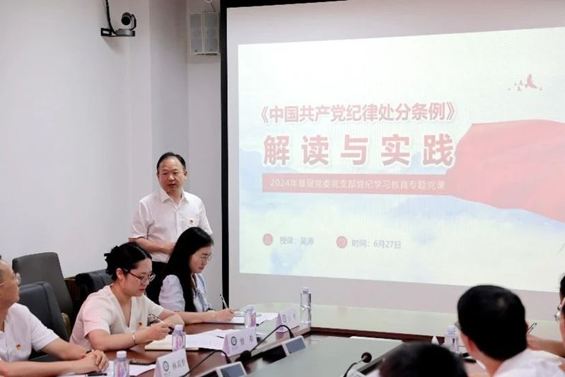 在理论学习环节,吴涛书记带来了一堂题为“《中国共产党纪律处分条例》解读与实践”的生动党课,详细解读了《条例》数次修订过程中的新增内容,并结合实际指出开展党纪学习教育的重要性,他强调,我们要深刻认识遵守党纪的重要性和必要性,对违反党的纪律的行为严肃查处,绝不姑息迁就,同时要注重发挥《条例》在全面从严治党中的基础性作用,将其与党的其它制度相结合,做到心中有党、心中有民、心中有责和心中有戒律,用更加坚定的信念、更加务实的作风,为实现党的历史使命而不懈奋斗。唐浩华书记领学了习近平总书记关于全面加强党的纪律建设的重要论述和“7·9”重要讲话精神,表示要深刻认识新形势新任务新要求,同向同行、同题共答,系统学习把握党中央和习近平总书记对机关党的建设的系列决策部署,以重要讲话精神为指导,精心谋划机关党建工作,切实用讲话精神武装头脑、指导实践、推动工作,全面提高机关党建工作质量的责任感、使命感和紧迫感。