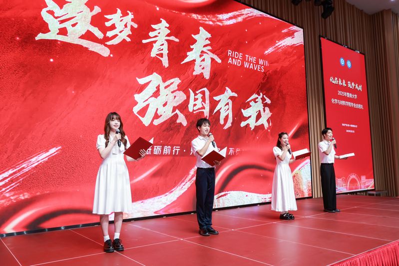 典礼上,学院对谭一叶等13位本、研优秀毕业生进行表彰;接着,学生代表向邵桂珍等8位资深教师献花致谢。随后,徐乐佳、雷铭杰、范嘉颖、康懿四位同学的诗朗诵《珠江潮起处,化材逐梦人》将气氛推向高潮。“电镜之下,慧眼如炬;谱图之中,匠心独到……”毕业生们用铿锵诗句宣誓:“以青春之名,与时代的脉搏同频共振,与科研强国的宏伟蓝图紧密相连!”
