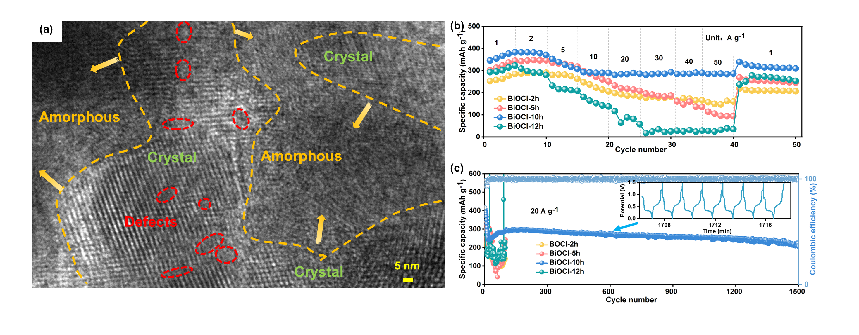 图1.(a)BiOCl-10h的HRTEM图。(b-c)BiOCl-10h负极的倍率和循环性能。