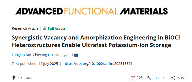 近日,学院李宏岩副教授在国际知名期刊《Advanced Functional Materials》(IF=19)上发表了题为“Synergistic Vacancy and Amorphization Engineering in BiOCl Heterostructures Enable Ultrafast Potassium-Ion Storage”的最新研究,提出并验证了“空位-非晶耦合”协同机制,为三元层状化合物实现超快、超长寿命钾离子存储提供了新思路。李宏岩副教授为论文唯一通讯作者,开云kaiyun官方网站为唯一通讯单位。